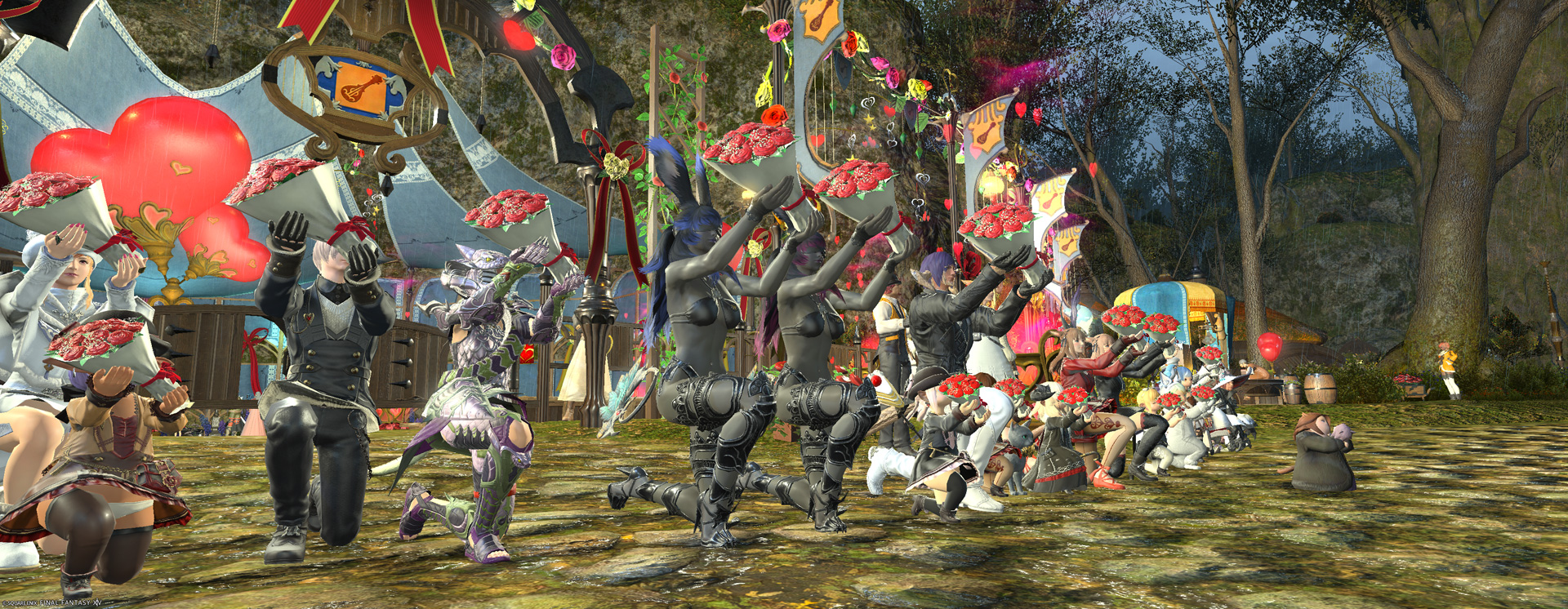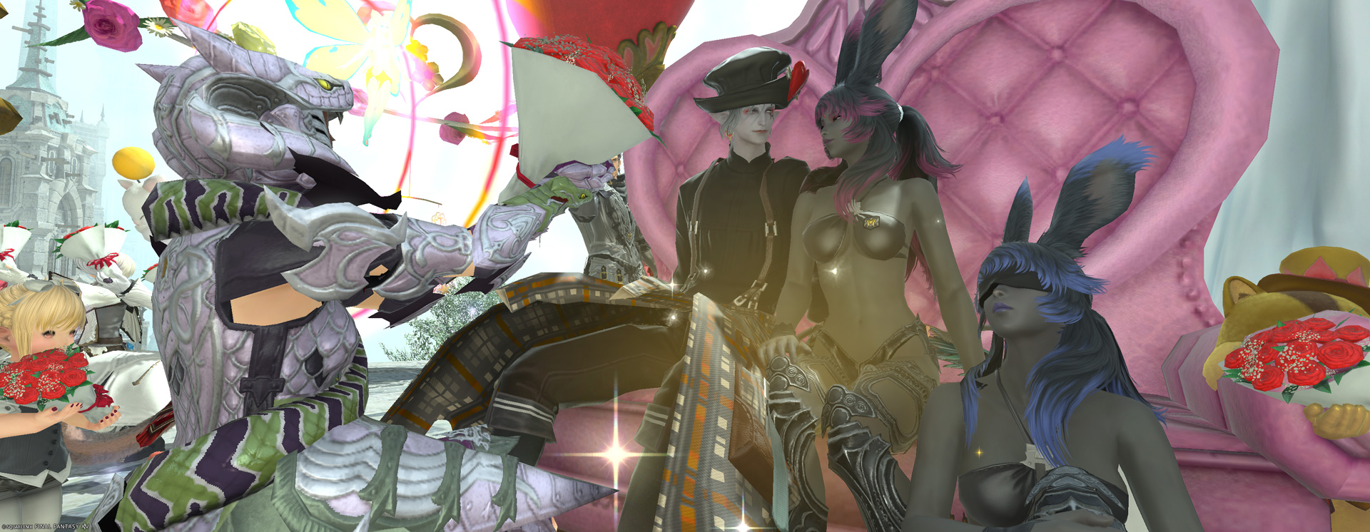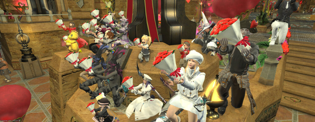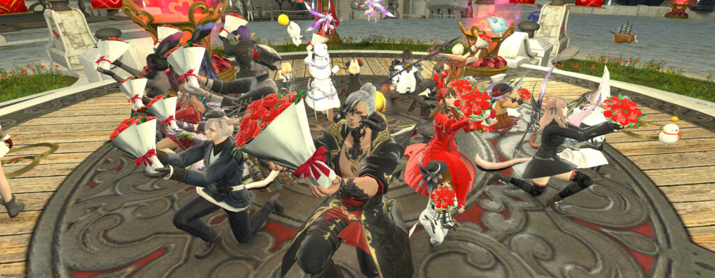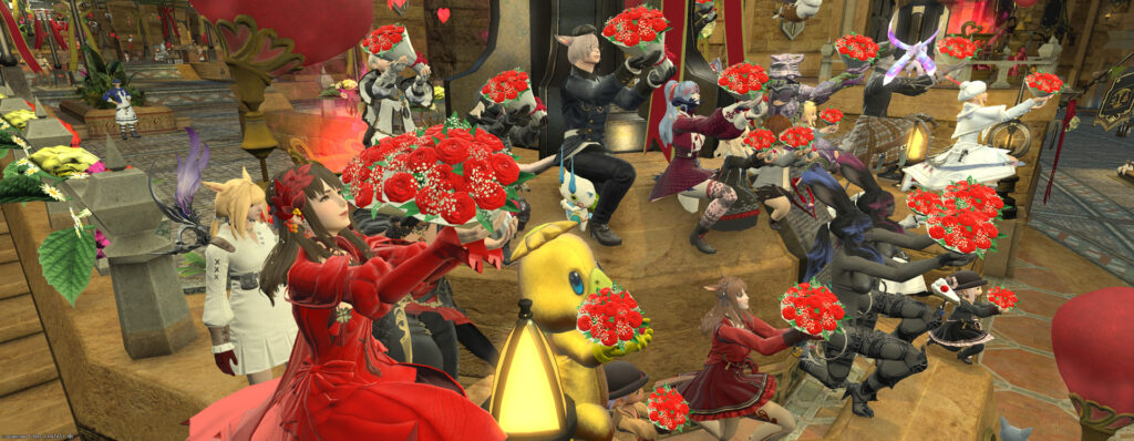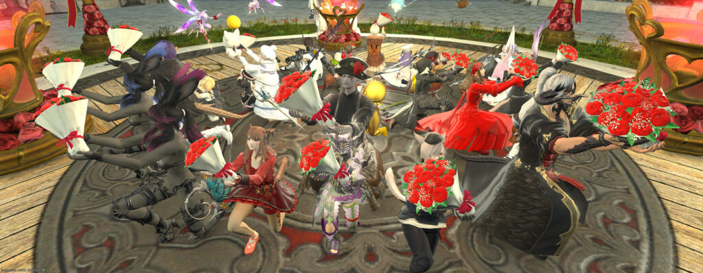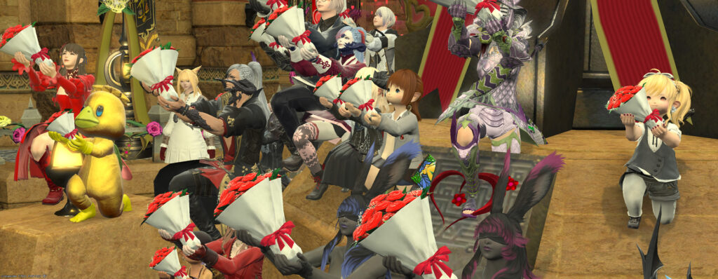今回の「花束エモート」は良い感じですね~。永続エモートなので、なにかと使い所が有る感じでいいです。エタバンとかでも使えるだろうねぇ~(*´ω`*) あとグルポ入った瞬間に止めれば、立った状態で花束持ってて、それもまたいいらしい!