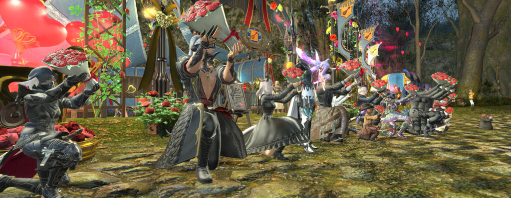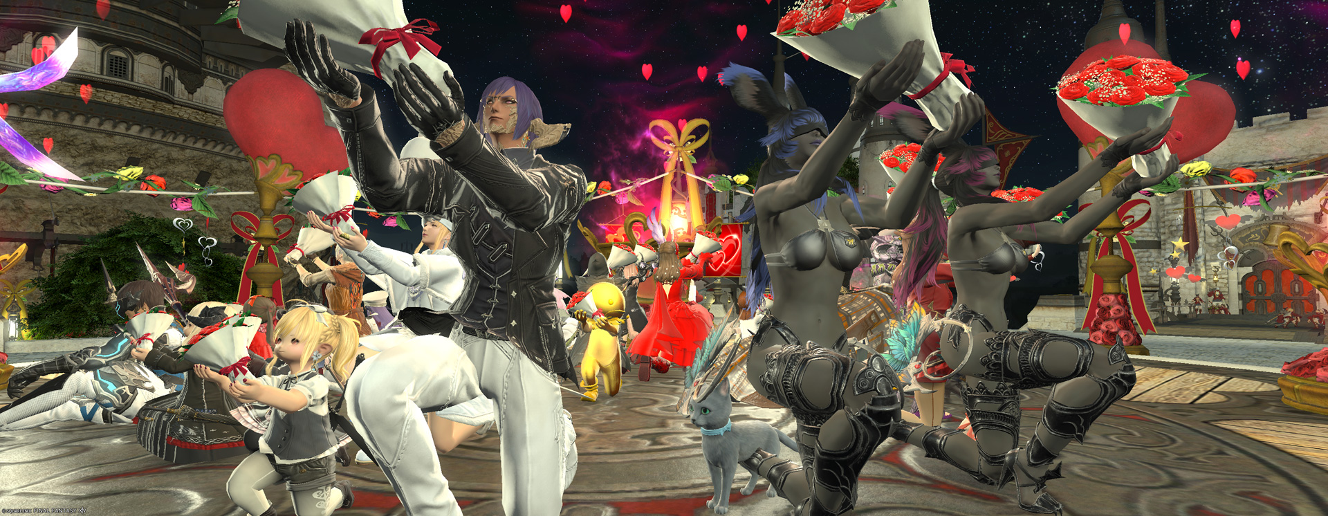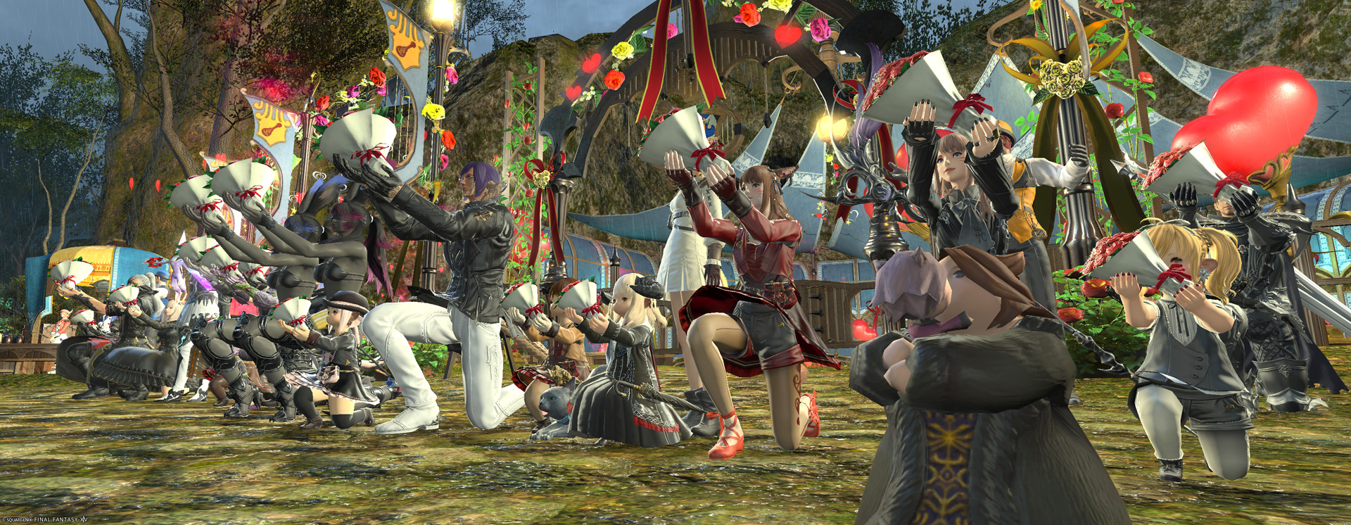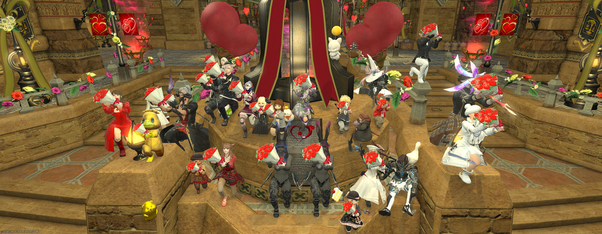 今回の「花束エモート」は良い感じですね~。永続エモートなので、なにかと使い所が有る感じでいいです。エタバンとかでも使えるだろうねぇ~(*´ω`*) あとグルポ入った瞬間に止めれば、立った状態で花束持ってて、それもまたいいらしい!